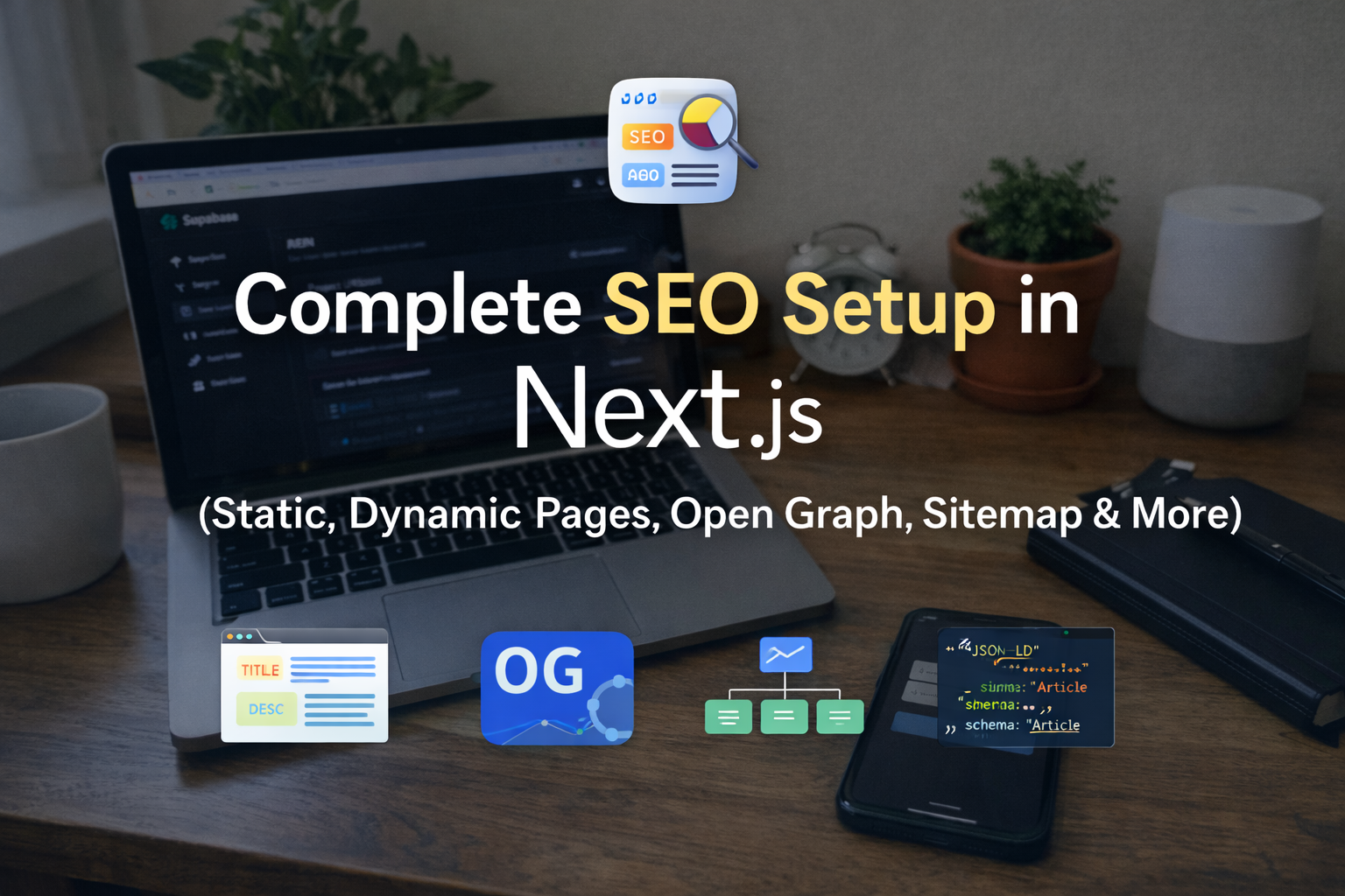 Learn how to implement complete SEO in Next.js App Router, including static metadata, dynamic pages, Open Graph, structured data, sitemap, robots.txt, and production best practices.