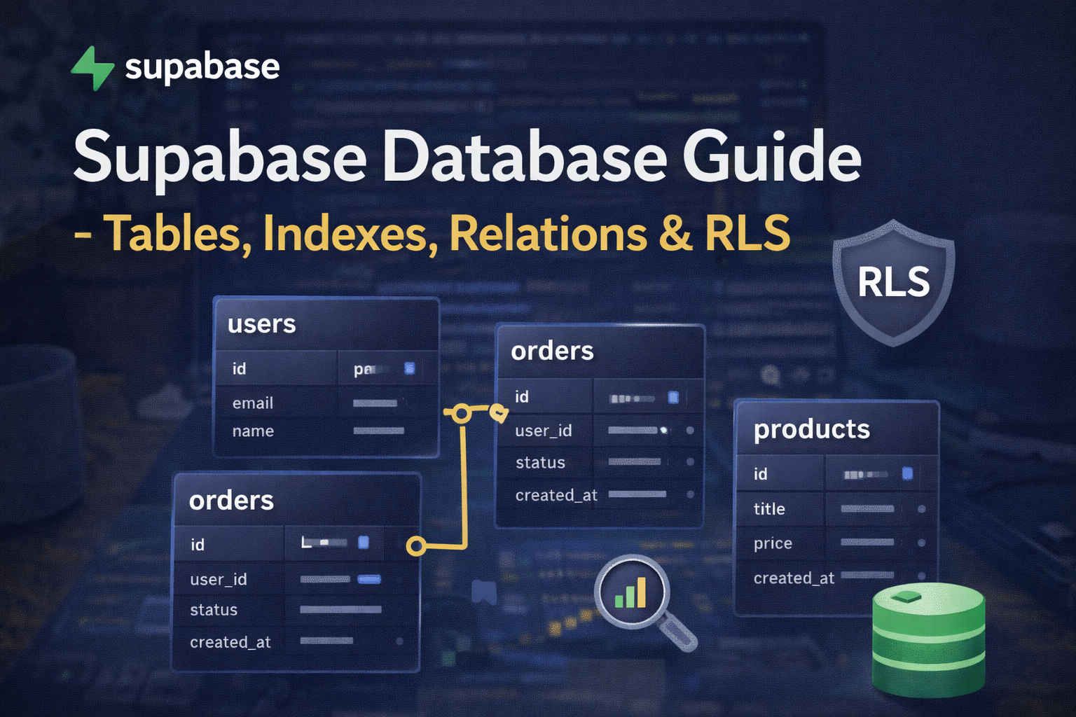 Learn how to design Supabase databases with tables, indexes, relationships, unique constraints, and Row Level Security (RLS) using practical SQL examples for production apps.