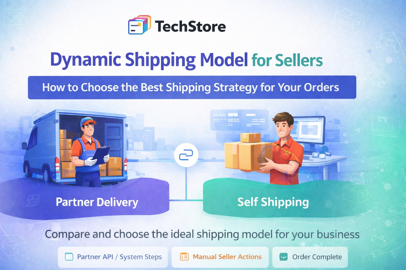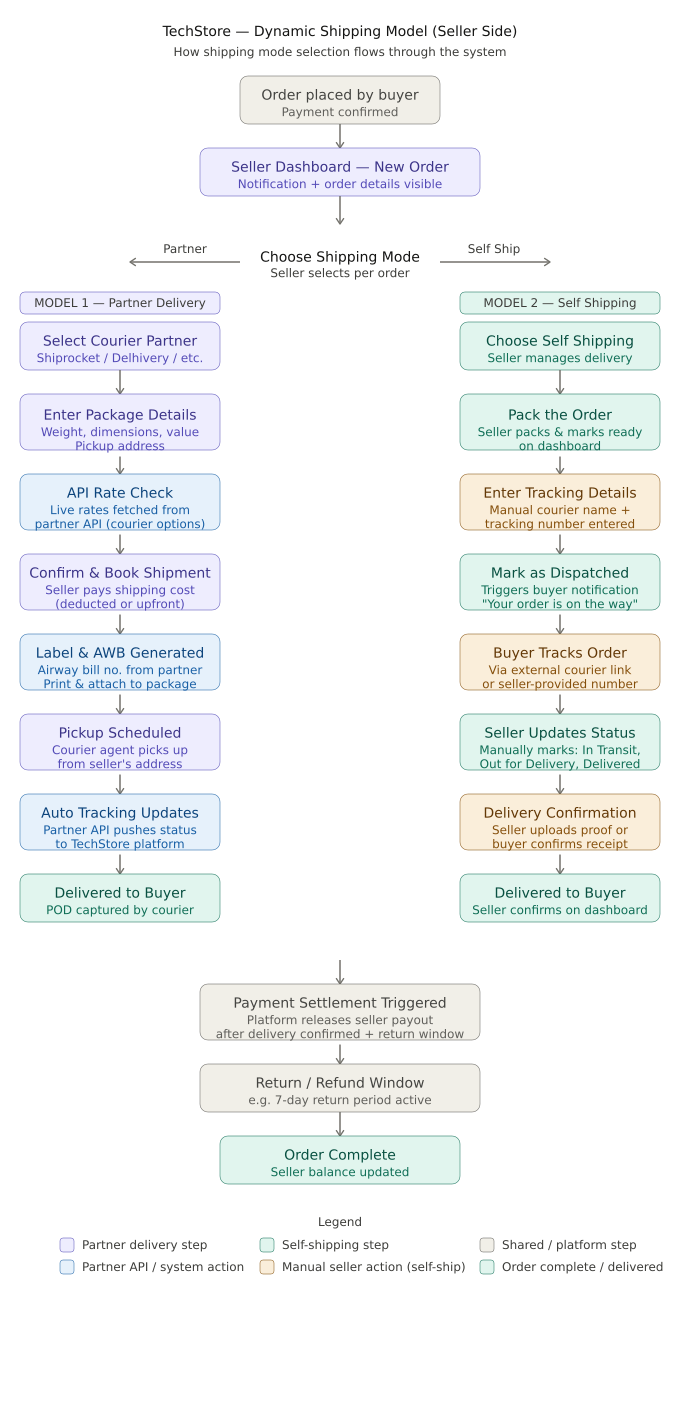 The seller picks a courier partner, enters package details (weight, dimensions, pickup address), and your app hits the partner's API to fetch live shipping rates. The seller confirms and books — the cost is either deducted from their balance or charged upfront. The partner API auto-generates an AWB (Airway Bill Number) and label. A pickup is scheduled, the courier collects from the seller, and tracking updates are automatically pushed back into TechStore via webhook. No manual effort needed after dispatch.